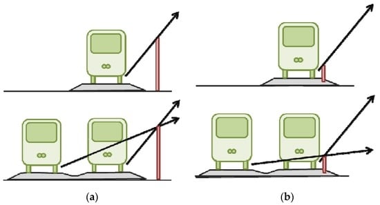It is worth pointing out that an ideal geometry on turnouts, especially of the crossing nose, helps to avoid loss of contact between the wheels and the rail at these elements, hence the effects of impact forces generated due to the dipped-like trajectory are generally lower than is regular conditions of degraded track or track geometry []. Furthermore, noise barriers are considered to help establish noise control everywhere as they are low-investment infrastructure with a maximum height of 2 m above rail head. In total, 280,000 km of the European network is fringed by these barriers, which culminates in an annual cost of 70,000 euros per km for noise barriers with a total annual cost for Europe of 20 billion euros, which is called the equivalent barrier cost [].
