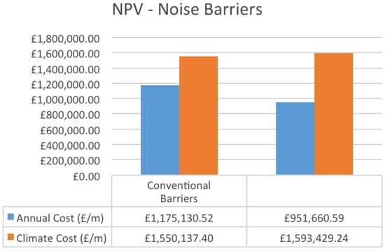 The results shown in Figure 9 reveal that the low close noise barriers are a better option across a long period of analysis. The high investment costs for the conventional barriers block the viability of using them for the entire extensions of track, but the conditions of which the properties of each type works better should be considered. In twin tracks, low close barriers are not as effective, and the use of conventional ones should be studied. Since special trackworks are complex systems, the feasibility of having to opt to one over another might be a downside to this method.
