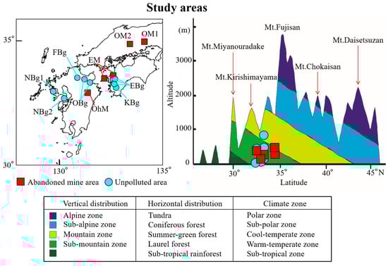 This study was conducted at abandoned mine sites and unpolluted areas at altitudes between 10 and 800 m above sea level in warm-temperate and cool-temperate zones in southwest Japan (Figure 1). Metals, such as Cu, Zn, Sn, and Pb, had been smelted at the abandoned mine sites, which closed at least 40 years before the experiment. Surfaces of waste dumps at the abandoned mine sites consisted mainly of slag fragments and tailings. Solidified and coherent slag was partially exposed on the dumps. The unpolluted areas had almost no ore deposits, and no heavy metal pollution had been reported in these areas.