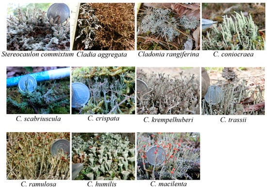 At least 10 Cladoniaceae lichens and a Stereocaulaceae lichen occurred on soil, rock, and/or mine wastes in the study areas. The tested lichens were identified as follows: Stereocaulon commixtum (Asah.) Asah.; Cladia aggregata (Sw.) Nyl.; Cladonia rangiferina (L.) F. H. Wigg.; C. coniocraea (Flörke) Spreng.; C. scabriuscula (Delise ex Duby) Nyl.; C. crispata (Ach.) Flot. var. crispata; C. krempelhuberi Vain.; C. trassii Ahti; C. ramulosa (With.) J. R. Laundon; C. humilis (With.) J. R. Laundon; and C. macilenta Hoffm (Figure 2).