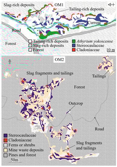 The S. commixtum, Cladia aggregata, Cladonia rangiferina, C. crispata, C. macilenta, C. humilis, C. ramulosa, C. krempelhuberi, and C. trassii grew in both unpolluted and polluted areas. Distributions of these lichens showed several dense areas on the waste dumps (Figure 3). The S. commixtum occurred mainly on slag fragments, tailings, and rudaceous soil. The C. crispata, C. krempelhuberi, and C. trassii occurred mainly on the rudaceous soil. The remaining Cladonia spp. and Cladia aggregata occurred mainly on humus soil and dead leaves, e.g., from ferns, such as Athyrium yokoscense, which are known as an accumulator and bioindicator for Cu, Zn, Cd, and/or Pb [,,,]. Cladonia spp. were often associated with other Cladonia lichens.