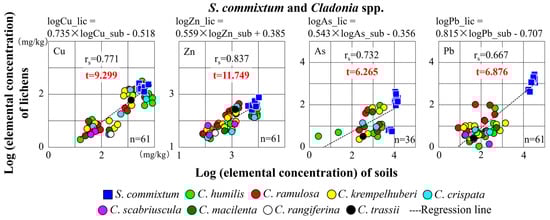 Scatterplots were used to determine the relationships between concentrations of trace elements in lichens and the corresponding substrata. The scatterplots showed that concentrations of Cu, Zn, As, and Pb in all lichens, including S. commixtum and eight Cladonia spp., were positively correlated with those in the corresponding substrata regardless of lichen species, location, habitat, types of substrata, constituents of substrata, or particle sizes of soils (Figure 4 and Figure 5). The scatterplots showed no local maximum points, but a linear distribution under a logarithmic scale.