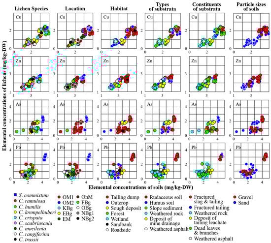 Scatterplots of Cu, Zn, As, and Pb concentrations in lichens and the corresponding substrata, separated by lichen species, location, habitat, types of substrata, constituents of substrata, and particle sizes of soils using different colors.