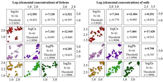 Scatter matrices showing the relationships among each Cu, Zn, As, and Pb concentration in lichens and soils after logarithmic transformation, with regression lines.