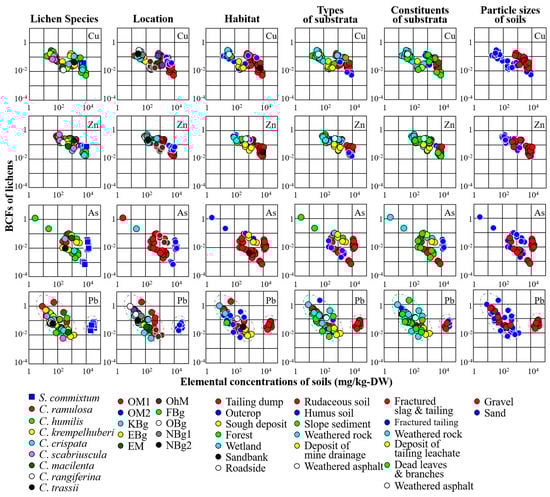 Scatterplots showing relationships between the BCFs and the elemental concentrations in soils, separated by lichen species, location, habitat, types of substrata, constituents of substrata, and particle sizes of soils using different colors.