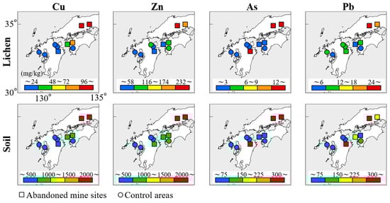 As shown in Figure 8, the plots of Cu, Zn, and As in the lichens showed similar distributions as those in the soils. The distribution of Pb plots, however, varied widely. The variation in the Pb distribution may be affected by differences of bioavailability and/or the dissolution rate of Pb in metal minerals from those of the other elements. Consequently, the maps created using lichens detected almost all of the Cu, Zn, and As pollution in the soil.