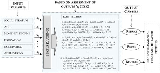 To identify socio-demographic profiles that explain the consumer behaviors aimed at developing pro-environmental practices, it was necessary to develop both a fuzzy model, which included six input variables for socio-demographic characteristics, and a vectorized output for pro-environmental practices (reduce, reuse, recycle), with 10 fuzzy rules being used for each output value.