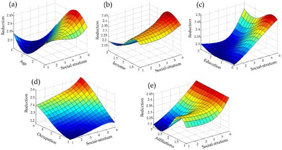 As an example, in Figure 3, the analyses for the dependent variable “reduction in consumption” based on the independent variable “socioeconomic stratum”, and its relation with other demographic variables, were reported. The range of colors indicates whether a performed practice is positive or negative, with blue identifying a positive practice and brown identifying a negative practice. This figure shows that the stratum variable is determinant in its relation to the reduction in consumption, determining consumers that perform this pro-environmental practice at all times and enhancing the development of the reduction practice when the stratum is high. One can observe how, in relation to educational level, reduction is shown to be positive when the stratum is high, and the education level is low. However, this behavior was found to be negative when analyzing the lower stratum and increasing the education level. At a medium to high stratum with incomes above $920.00, reduction is positive. In the lower stratum (particularly farms), we observed an absence of the reduction practice when the monthly income is between $540.00 and $920.00. An important pattern is shown in relation to the socioeconomic stratum and consumer age, demonstrating that reduction in consumption increases if the stratum increases and the consumer age decreases. That is, the youngest individuals are mostly likely to develop this practice.
