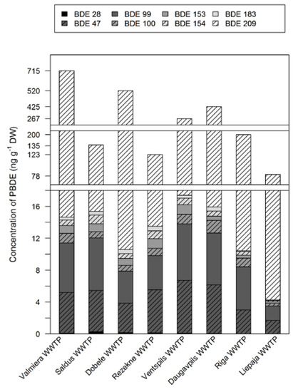 The concentrations of PBDE congeners (BDE 28, 47, 99, 100, 153, 154, 183, 209) in WWTPs sludge ranged from 0.1 ng·g−1 DW (BDE 28) to 700 ng·g−1 DW (BDE 209). Both values were observed at the Valmiera WWTP (Figure 1). The sum of all of the detected congeners (∑8PBDE) varied substantially among WWTPs, from 78 ng·g−1 DW at the Liepaja WWTP, to 714 ng·g−1 DW at the Valmiera WWTP. The concentrations of PBDEs in the sewage sludge reported in this study, are at the low end of the wide concentration range reported elsewhere for WWTPs’ sludge [6,39,40], and similar to the earlier studies, the concentrations of BDE 209 (on average 296 ng·g−1 DW) constituted 89%–98% of the ∑8PBDE concentration registered. The second (BDE 99) and third (BDE 47) most abundant PBDE congeners corresponded to only 0.8%–4.9% and 0.7%–4.4% of the ∑8PBDE, respectively, while the remaining congeners constituted less than 1% of the ∑8PBDE.