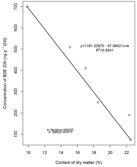 The largest variations for a single congener in the WWTPs, were observed for BDE 209, as has also been observed in previous studies [6], while the levels of other congeners exhibited lower levels of variation. The observed variability in the BDE 209 levels could not be attributed to the city size, or the capacity of the WWTP, which is in agreement with conclusions from earlier studies [47]. At the same time, the approach for explaining the variance in BDE 209 levels, in relation to the different effluent types, e.g., industrial versus domestic [6], cannot be used in this study, since domestic sources of waste water dominated over industrial sources, in all cases. We cannot exclude that, in cities, such as Valmiera or Dobele, where comparatively high levels of BDE 209 in WWTP sludge were observed, the elevated BDE 209 input was generated by industrial objects. However, to the best of our knowledge, this is not the case. So, it is plausible to assume that the generation of the BDE 209 load per inhabitant, could be rather similar in all observed cities, but the capacity of WWTP to trap BDE 209, is different, depending on sludge properties. This assumption is supported by the observed negative correlation (r = −0.48, p = 0.2256) between the content of dry matter and the BDE 209 concentration (Table 3), which clearly demonstrates that fine-grained sludge particles, with a larger relative surface area, adsorb BDE 209 much more effectively than relatively coarser-grained sludge particles (Figure 2). At the same time, it should be recognized that this correlation is built on a limited number of observation points, and two cases clearly diverge from the obtained linear regression curve (Figure 2). Therefore, prior to drawing a final conclusion, the factors that can possibly affect the effectiveness of BDE 209 retention in WWTP sludge, should be tested in a more detailed study.