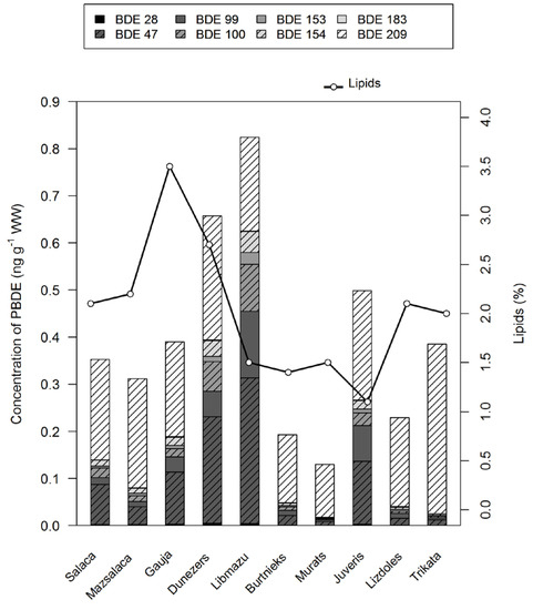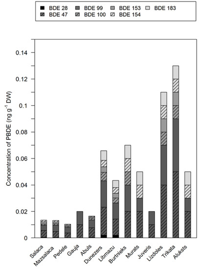 The environmental concentrations of PBDE congeners observed in this study, especially BDE 209, are relatively low in comparison to previously reported values [10,41,42]. This can most likely be explained by the lack of using sewage sludge in agricultural applications in Latvia. Furthermore, it seems that, at present, the observed differences of PBDE congener concentrations in lake and river sediments, can be attributed to differences in sediment properties. For example, the sediments that have a low content of dry matter, and a relatively high content of organic carbon, exhibit substantially higher concentrations of PBDEs than those with a high content of sediment dry matter (Figure 4).