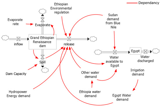 Figure 2 shows the focus of the study. The flow path of the water after the release from the dam consists of a diversion to Sudan along the stream and then towards Egypt for irrigation and municipal use before being diverted into the sea. The model is subject to mass balance equations, dam storage, non-negativity of the variables and transfers, and it is made of different sub-models. Our focal point in this study is on methodology development of modelling and simulation—how dependencies of different factors in water management can lead to different implication. We use Ethiopian management of the GERD dam as the case study that fits our purpose of illustration, and we do not include the data from the downstream Aswan High Dam in Egypt, and the Roseires and Sennar dams located in Sudan. Including these and other factors, while possibly changing the results, does not change the methodology development, which is the main intention of this paper.
