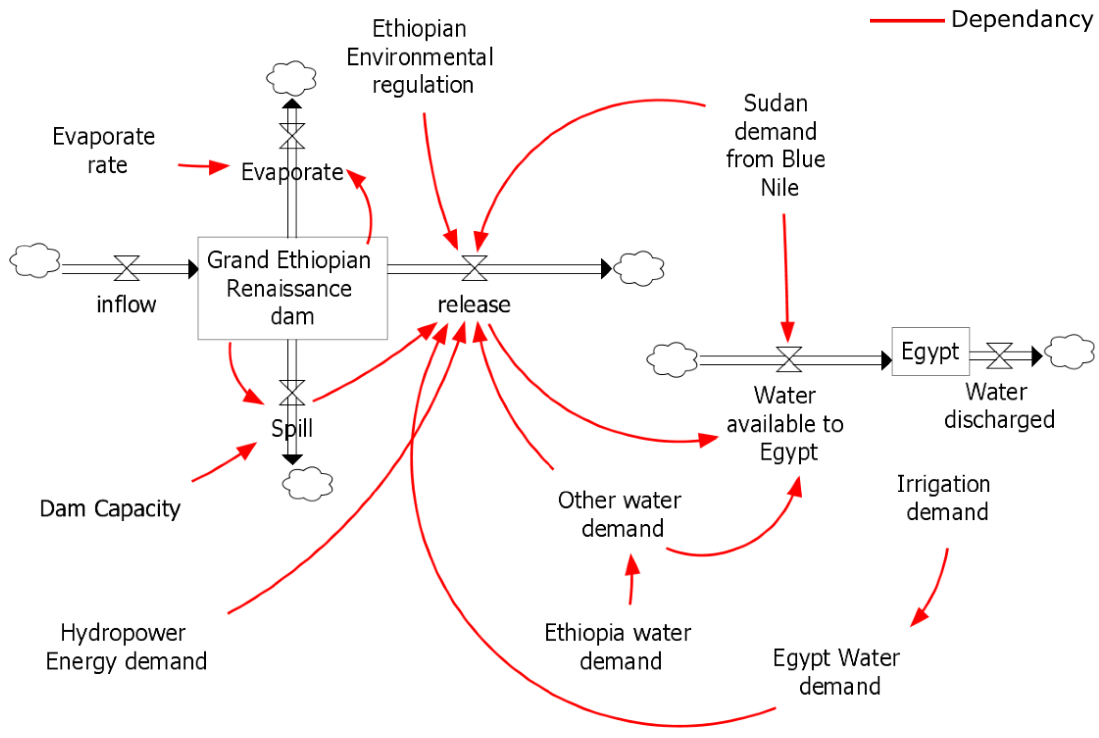 With many beneficiaries of water usage, water resource management decisions are relevant if all resource dependencies are considered in integrated modelling. System dynamic models provide a platform to study the interaction between different players and facilitate the understanding of resource linkage in an integrated approach [32]. The models are used to represent the whole problem as a connection between different elements and to help encourage system thinking [33,34]. This would allow better and more transparent understanding of each component of the whole system and the dependencies involved. In this paper, we show the resource relationship using the system dynamic model. We represent the water, irrigation and energy demand of the upstream and downstream countries within the model, and illustrate how they perform under different management policies. Our study is methodological and our developed model fits our purpose of demonstrating how dependencies can make the water management decision making a challenge.