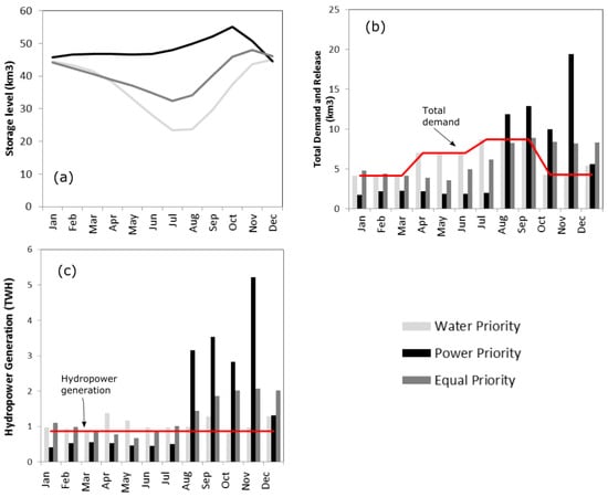 It can be seen that as the reliability ratio, r, increases, the amount of hydropower generated will be reduced and the maximum hydropower that can be produced from the system is 19.53 TWH. This is denoted as a power priority scenario and the system only operates at 60% irrigation and municipal reliability. As the result of constant storage of water for the hydraulic head, the amount of water supplied for downstream uses will be affected, as they are not supplied according to their demand pattern. As for the water priority scenario, the reliability ratio is r = 1, where all water demands are fully supplied, and this causes the hydropower production to drop by 35% from 19.53 TWH to 12.72 TWH. This scenario requires constant release of water to satisfy the demand downstream, and the water level in the reservoir target storage will be low throughout the year. The third scenario is to find a balance between water and energy, which is denoted as equal priority where the system will meet 85% of reliability and will also generate 85% of the hydropower potential.