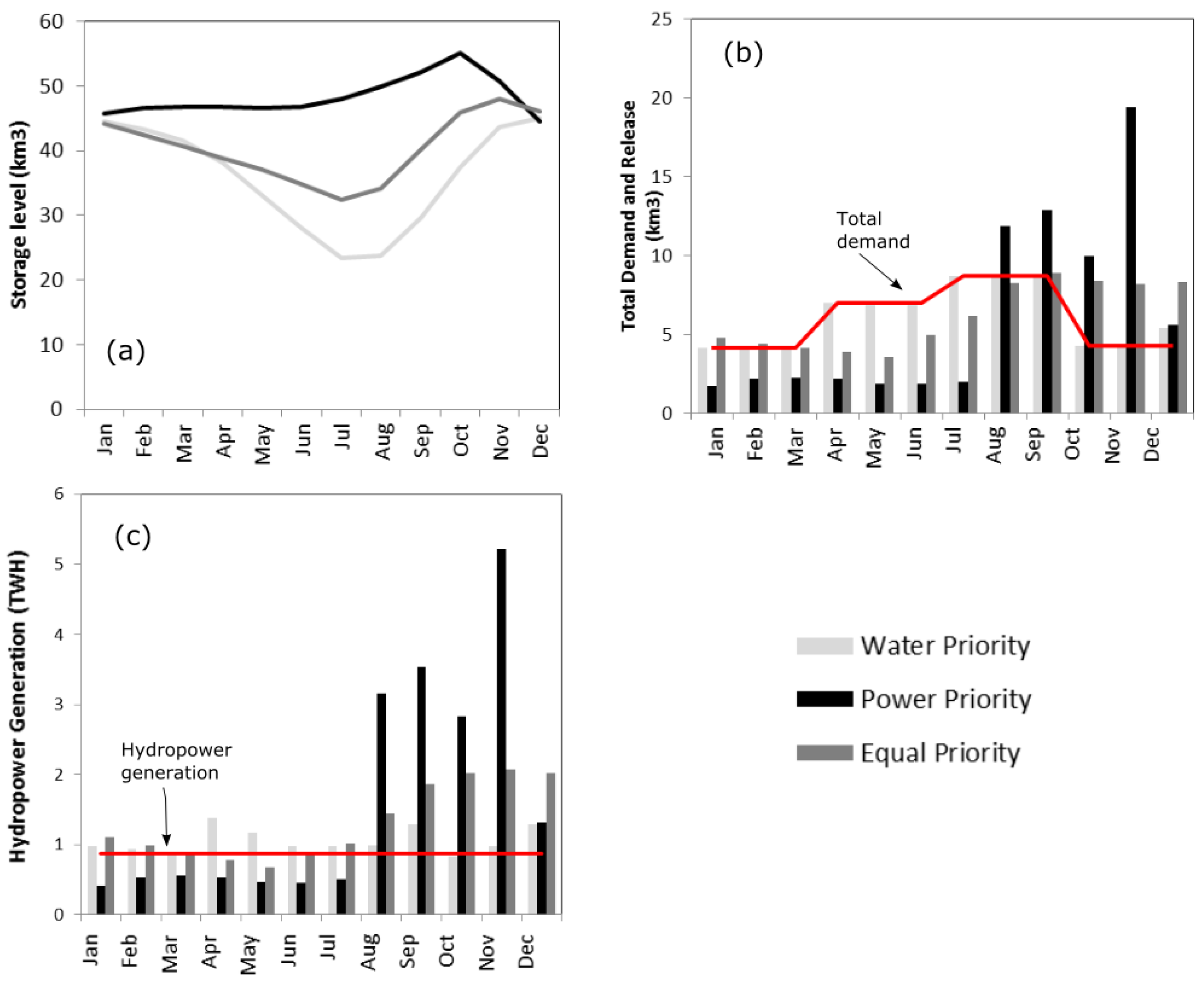 (a) monthly optimal storage levels for three different operating policies; (b) monthly demands for water downstream and monthly release rates from the dam; and (c) monthly hydropower generation and firm power demand.