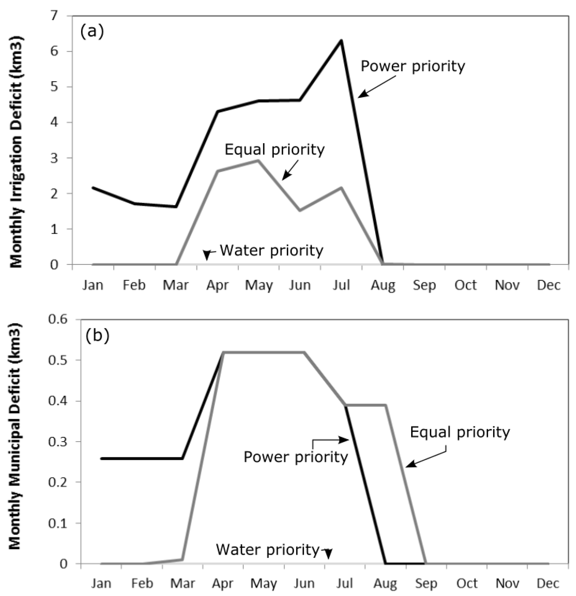 Figure 4 shows the monthly irrigation and municipal deficit for the three operating policies. The result of lower flow during the winter months suggests that all the policies will have greater water deficit compared to the summer months. In the water priority scenario, the dam only operates according to demand, and there is no water deficit in this policy. The annual deficit for irrigation and municipal are 25.3 km and 2.7 km, respectively. In the balance scenario where the system will operate on a trade-off basis, irrigation and municipal deficits can be reduced to 9.2 km and 2.3 km, respectively. This scenario will achieve 85% of water demand as well as producing 15.8 terawatt-hour (TWH) energy for the year and, except for two months, it produces energy above firm power demand.