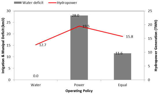 We note that, if cooperation is encouraged for the balance between water and energy, the hydropower potential can be fully utilised, and, at the same time, the deficit of the downstream uses can be reduced. The introduction of the reservoir will not only bring benefits to Ethiopia but also to the community within the basin. If the dam is operated efficiently, the hydropower potential can be fully utilised to produce cleaner energy and possibly extra power that can be exported to Egypt and Sudan. While the dam will provide a sustainable power resource, it will also act as storage for water, which will benefit the downstream users. The results indicate that the single scenario management options do not provide a viable operation of the dam. That is, the water priority scenario is able to meet all water demands downstream, but the hydropower potential will not be fully utilised. The annual water deficits and hydropower generation for the three policies are shown in Figure 5.