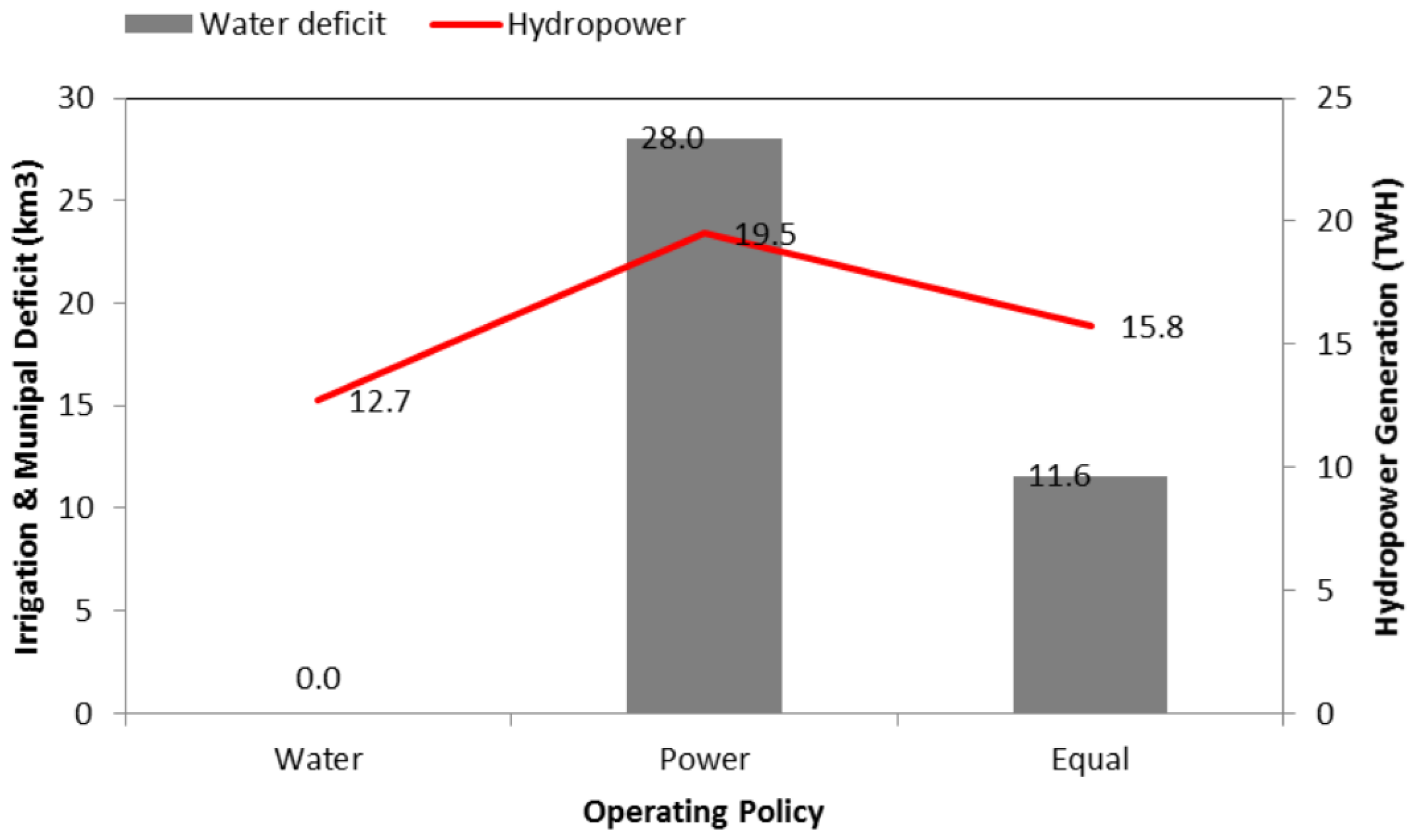 Annual deficits and hydropower generation for three different operating policies.