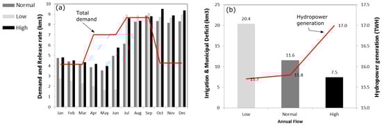 As river flows are sensitive to climate change and variability, the sensitivity of the inflow into the reservoir is tested against lower and higher flows. In this study, the multiplier factors of 0.9 and 1.1 are used to generate the lower and higher flow, respectively, to test the sensitivity of the results. By multiplying the factor, the nominal annual inflow into the reservoir is 73.8 km, the lower flow scenario is 66.4 km, and the higher flow is 81.2 km. These values are used in the simulation model with the same demands to generate monthly optimal storage and release rates for the changing flows. Figure 6a shows the release rate for each month. The policies for the three different flows are all optimised to produce an optimal operating system. During the low flow year, there will be insufficient water and most of the water is stored in the reservoir to increase the storage level for hydropower purposes and for the high level of agricultural demand during the wet season. This will cause an increase in the water supply deficit during the dry season. As for the higher flow year, the optimal water storage is lower than the normal and low flow event. This is because there is sufficient water for the demand and the consistent release of water will also increase the hydropower production, which will be closer to the maximum capacity and increase annual production.