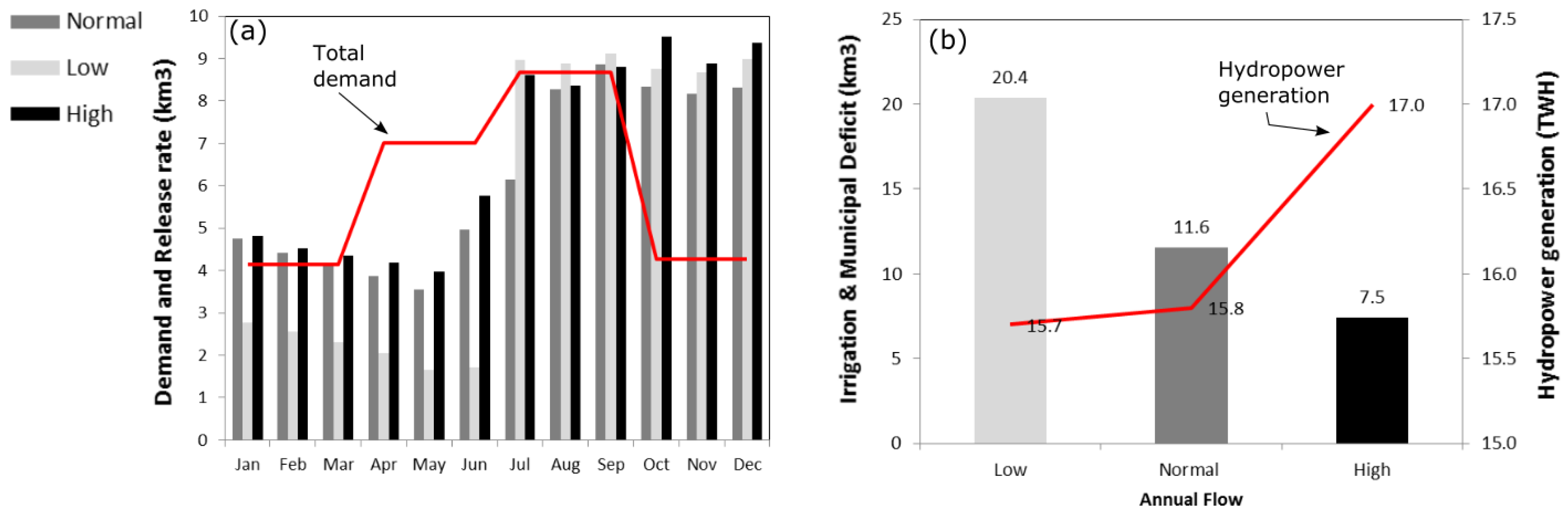 From the results in Figure 6b, it can be seen that the irrigation deficit and municipal deficit are increased by 8.8 km during the lower flow months while the annual hydropower production for both scenarios remains the same. The power production remains nearly the same because of constant storage of water for later release. The stored water will generate greater benefits if it is released during the summer for agricultural use and, at the same time, increases the hydraulic head for power generation. The drawback is that the stored water will cause an increase of water deficit during the dry season when the inflow is low as shown in Figure 6a. In addition, it is evident that water deficit occurs during the high flow events of months April to June as the increase in the inflow of water is not sufficient to meet all the demand without sacrificing hydropower generation. However, the water deficit can be reduced by 4.1 km (37%) from the normal flow while hydropower generation can be increased by 1.2 TWH (8%) during this event.