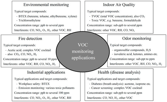 Measurements of volatile organic compounds (VOCs) are becoming ever more important due to stringent environmental regulations and increasing health concerns. Typical compounds with high relevance are benzene, naphthalene, formaldehyde, and tetrachloroethylene, but there are many more depending on the specific environment and the target application. Exposure to VOCs for a long time can have negative effects on human health, including damage to the respiratory system and skin irritations [1]. Moreover, VOCs are the main cause of the sick building syndrome [2,3]. Besides these unspecific adverse health effects, some VOCs are proven to be carcinogenic (e.g., benzene [4]) or are suspected to be carcinogenic (e.g., formaldehyde [5]). The specific challenge for VOC measurements are the low target concentrations: the respective guideline threshold values for some critical substances (in indoor air) are 0.1 mg/m3 (81 ppb) for formaldehyde and 0.01 mg/m3 (1.9 ppb) for naphthalene according to the World Health Organization (WHO) [4], and 5 µg/m3 (1.6 ppb) for benzene according to EU guidelines [6]. In other fields such as industrial monitoring and workplace safety, higher values apply, but these are currently trending down sharply, e.g., in Germany [7]. Furthermore, very high selectivity is required to discriminate highly toxic or carcinogenic VOCs from inorganic gases such as carbon monoxide (CO), nitrous oxides (NOx), ozone (O3), or hydrogen (H2), all of which occur naturally or are generated by (other) pollution sources less toxic or from benign VOCs such as ethanol. For the total VOC concentration (TVOC), WHO suggests a limit value of 1 ppm, i.e., three orders of magnitude above the lowest threshold limit values for hazardous VOCs. In other applications, the ratio between target VOC and interferent can even reach five orders of magnitude, e.g., for smoldering fire detection on coal mines, where 100 ppb ethane (C2H4) should be detected against a background of up to 1% methane (CH4) [8]. A field that has gained increasing interest in recent years in monitoring of odor compounds, which, while often not having a direct health effect, nevertheless considerably impact our quality of life. Typical compounds in this context are isovaleric acid (“sweat odor”), organosulfur compounds (thiols or mercaptan, e.g., (di-)methyl sulfide) as well as many esters, terpenes, amines, ketones, and, of course, aromatic compounds as well as hydrogen sulfide as an important inorganic odorant. Odor monitoring plays an increasing role in indoor air quality, but also in outdoor environmental monitoring, both at the source (emission measurements at the stack or the fence line) and at the impact side (odor nuisance monitoring) for various industries, e.g., waste treatment. Figure 1 gives an overview over VOC monitoring applications, also indicating relevant target gases and interferents. A more comprehensive overview is given in [9].