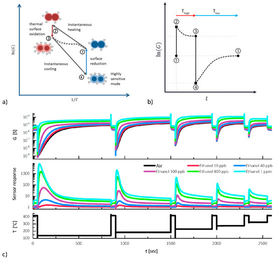 On the other hand, we have recently developed a model that shows that the sensitivity of MOS sensors can be improved significantly by temperature cycling. The first benefit of varying the sensor temperature over a broad range is immediately obvious as the sensor will at some time in the cycle reach the optimal temperature, i.e., with the highest sensitivity, for the target gas(es). In addition, temperature cycling with fast temperature changes will lead to non-equilibrium surface conditions and thus reaches states that cannot be achieved in static operation at constant temperature. By carefully choosing the operating parameters, the sensitivity can actually be boosted considerably, e.g., by first operating the sensor at high temperature which leads to a high surface coverage with ionosorbed oxygen. If the sensor is then cooled down rapidly, this leads to a surface at low temperature but with an abundance of reactive oxygen ions—a condition that cannot be achieved in static mode. Without gas, the ionosorbed oxygen will slowly desorb to reach the equilibrium state with only few oxygen ions at low temperature. A gas interacting with the adsorbed oxygen will strongly influence this relaxation process leading to faster equilibration. The sensitivity and the respective sensor response Ggas/Gzero during dynamic operation have been shown to be orders of magnitude higher than in static operating mode [25]. Figure 2 describes this effect schematically. The non-equilibrium states during dynamic operation can also improve the selectivity, so optimized cycling can be used to address the three “S’s”—sensitivity, selectivity, and stability—the key aspects for chemical sensor systems [26].