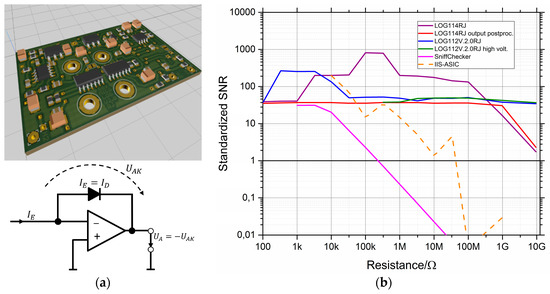 (a) Operating principle of a logarithmic amplifier based on the exponential current-voltage characteristic of a diode or transistor and PCB implementation. (b) Signal-to-Noise-Ratio (SNR) standardized to the same bandwidth of different logarithmic amplifiers compared to conventional electronics based on a linear AD converter (“SniffChecker” by 3S) and an integrated ASIC solution based on dynamic variation of measurement voltage and gain factor (IIS-ASIC, [47]).