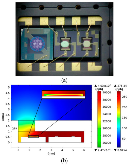 (a) Novel integrated pre-concentrator gas sensor microsystem combining a micro-pre-concentrator realized by deposition of MOF material on a micro-hotplate (left) with one or two gas sensors (right) in a single SMD package. Gas access is through a small opening above the pre-concentrator only. (b) Simulated gas concentrations inside the pre-concentrator material (left scale) and in the air (right scale), simulated for benzene and HKUST-1 as pre-concentrator material 1.5 s after start of desorption at 200 °C. The highest gas concentration is obtained inside the microsystem, i.e., at the locations of the two gas sensor chips S1 and S2. Adapted from [54].