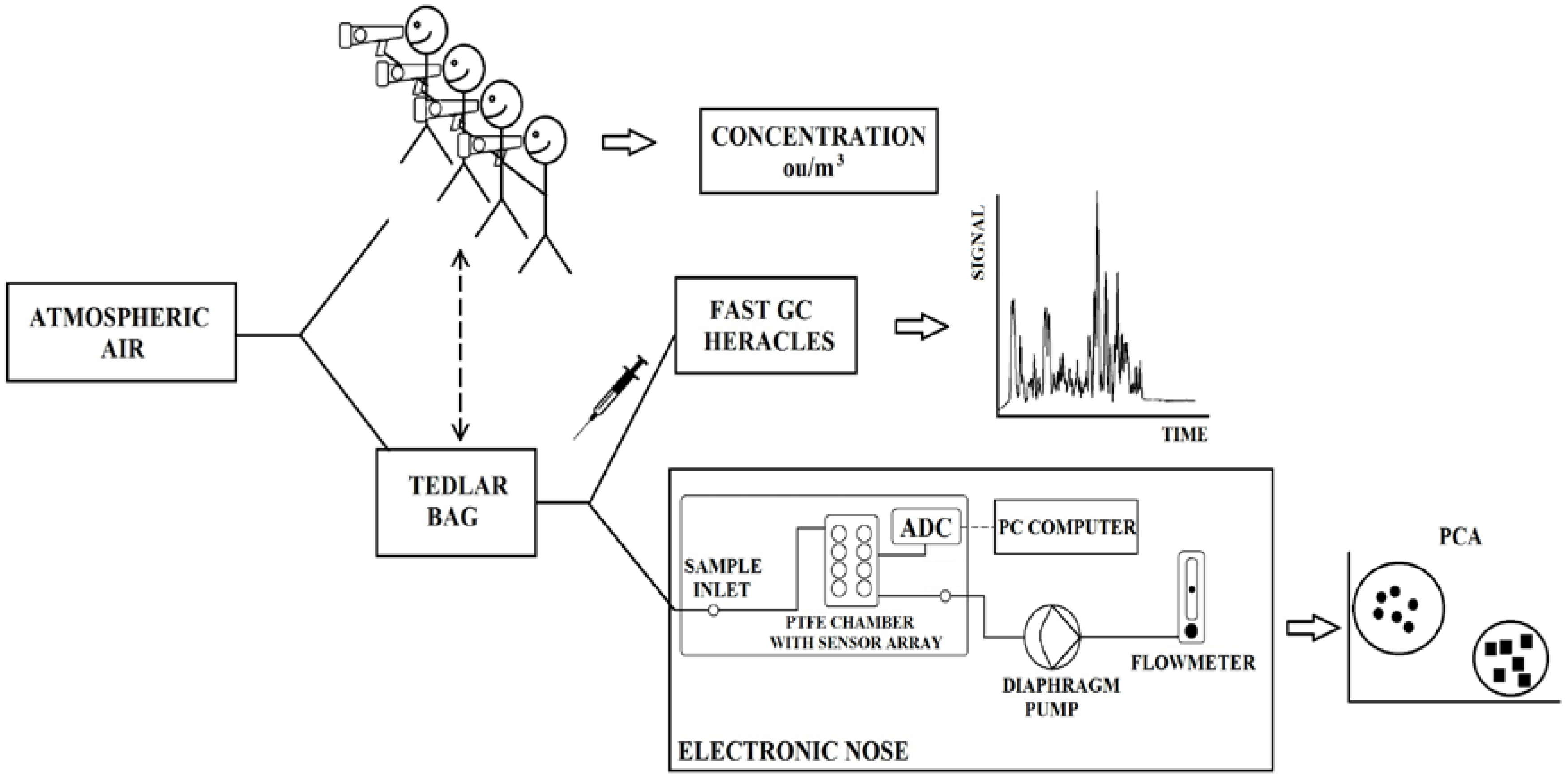 The acquisition of the information about the concentration levels of particular odorants in ambient air is indispensable for the complex evaluation of the condition of the natural environment [13,14]. This goal is reached by the utilization of suitable tools for the measurement and control of the level of air pollutants as well as for the identification of the presence of odorous compounds. The following devices for VOCs analysis in outdoor and indoor air can be distinguished: