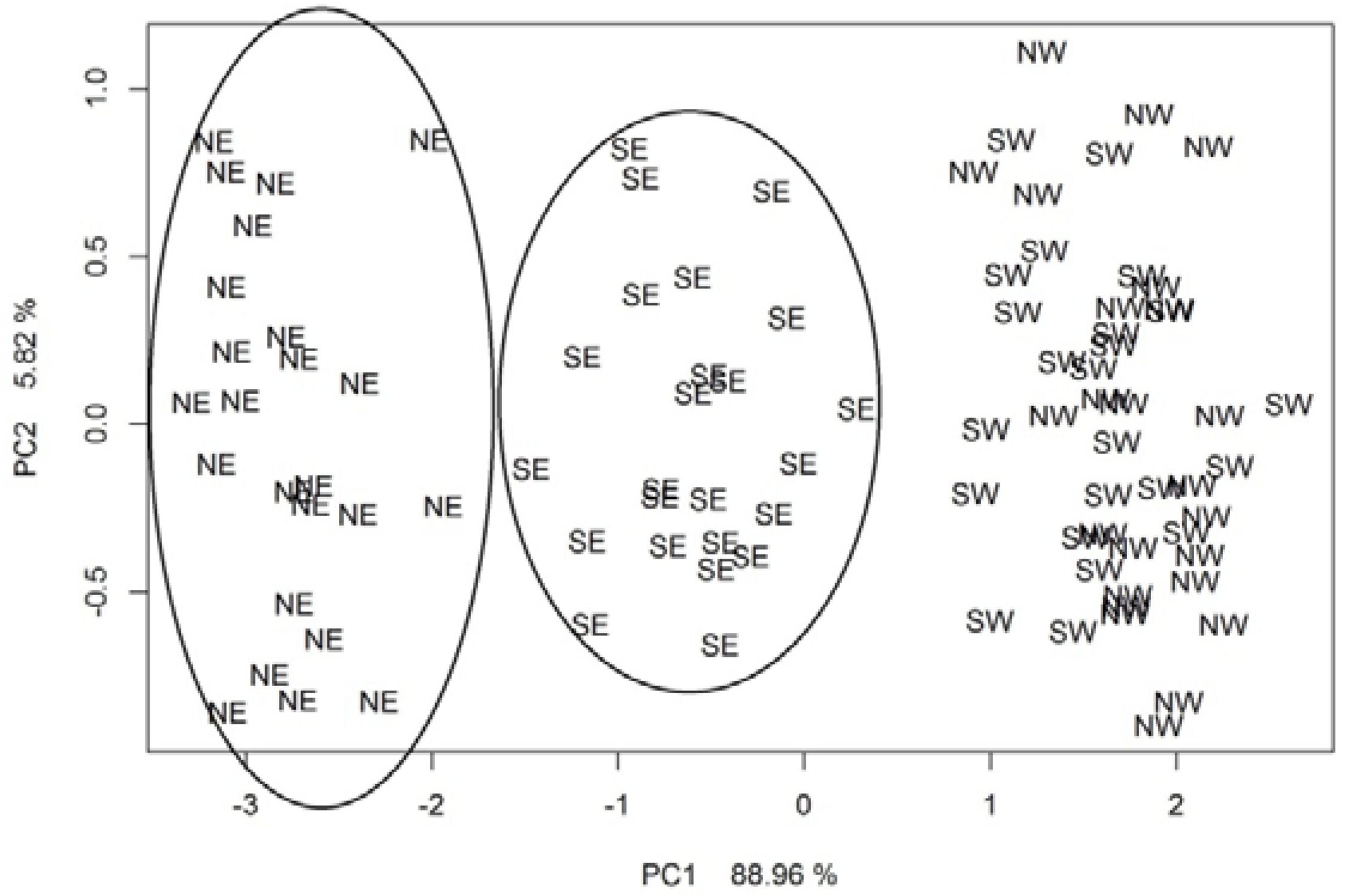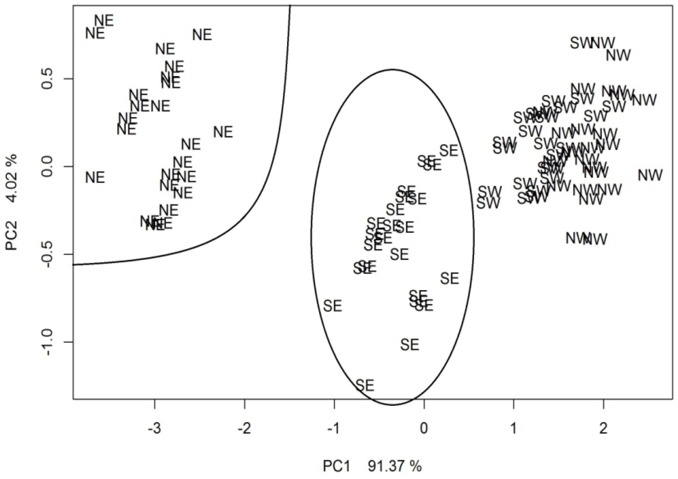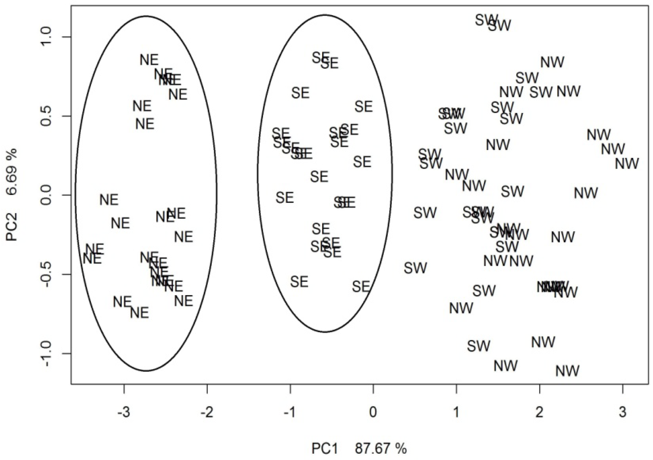 Figure 6 presents the PCA results for the ambient air samples collected in the vicinity of the municipal landfill when the measurements were performed with the commercial electronic nose of Fast GC-type during the spring–winter season. Also, in this case, there are three characteristic clusters of points on the two-dimensional plane. However, as compared to Figure 4, the clusters NE and SE are clearly resolved from the remaining points. Table 4 shows an error matrix with the results of the kNN (where k = 3) classification supported with the cross-validation method for the ambient air samples collected around the municipal landfill during the spring–winter season. The results of the performed classification originated from the investigation carried out with the commercial electronic nose of Fast GC-type. A total of 87.5% of the samples collected from the selected directions was correctly classified. The biggest number of correctly classified samples was 24 and they originated from the NE direction. In the remaining cases, the number of correctly classified samples was as follows: 23 for the SE direction, 21 for the NW direction and 16 for the SW direction. Correctness of classification was at the level of 100% for the NE direction, 95.8% for the SE direction, 87.5% for the NW direction and 66.7% for the SW direction.
