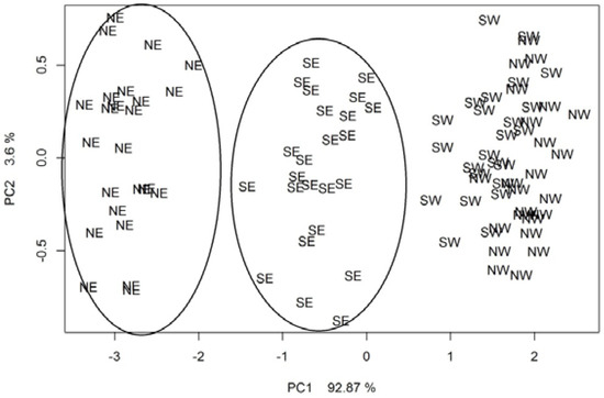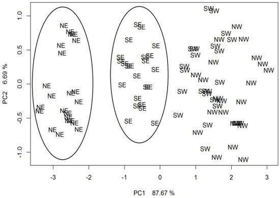 Figure 7 presents the PCA results for the ambient air samples collected in the vicinity of the municipal landfill when the measurements were performed with the electronic nose prototype during the spring season. Similar to Figure 5, there are three characteristic clusters of points corresponding to the air sampling sites. One cluster represents the samples collected along the NE direction, the second cluster corresponds to the SE direction and the third cluster is associated with the remaining two directions, which are NW and SW.