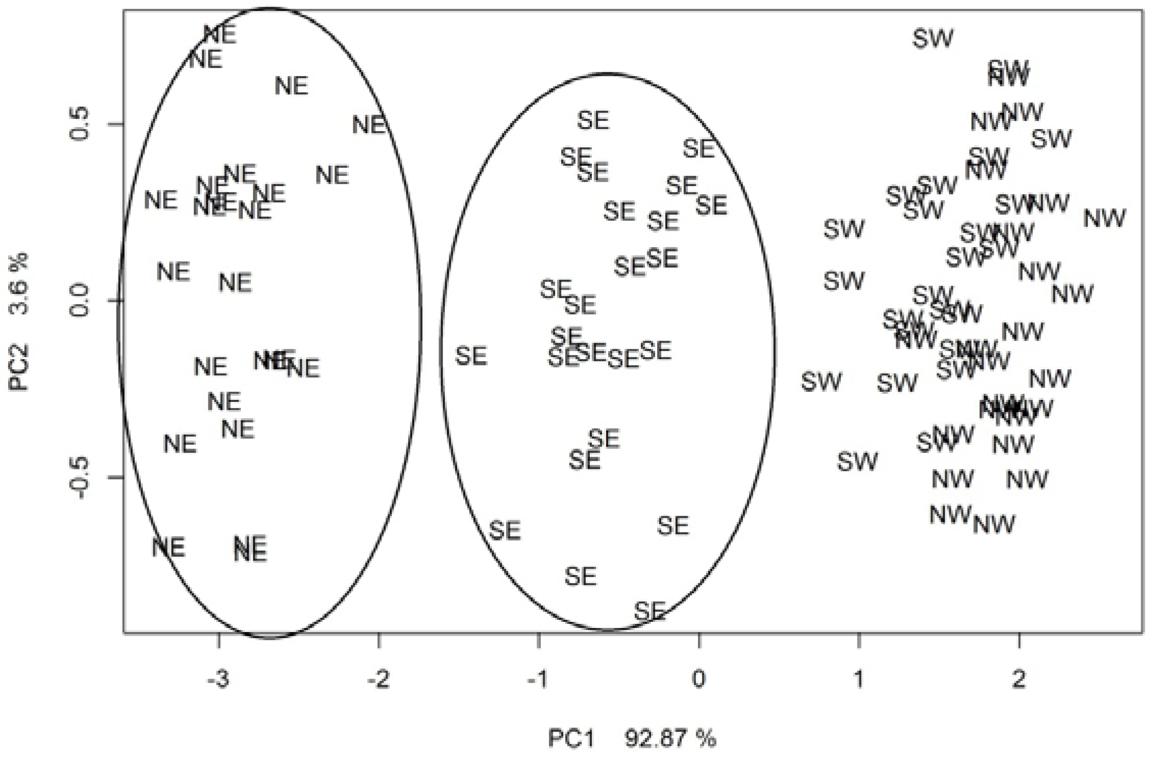 Figure 8 presents the PCA results for the ambient air samples collected in the vicinity of the municipal landfill when the measurements were performed with the commercial electronic nose of Fast GC-type during the spring season. However, as compared to Figure 5, the clusters NE and SE are clearly resolved from the remaining points. Table 7 shows an error matrix with the results of the kNN (where k = 3) classification supported with the cross-validation method for the ambient air samples collected around the municipal landfill during the spring season. The results of the performed classification originated from the investigation carried out with the commercial electronic nose of Fast GC-type. A total of 94.8% of the samples collected from the selected directions was correctly classified. The biggest number of correctly classified samples was 24 and they originated from the NE and SE direction. In the remaining cases, the number of correctly classified samples was as follows: 22 for the SW direction, 21 for the NW direction. Correctness of classification was at the level of 100% for the NE and SE direction, 91.7% for the SW direction, 87.5% for the NW direction.