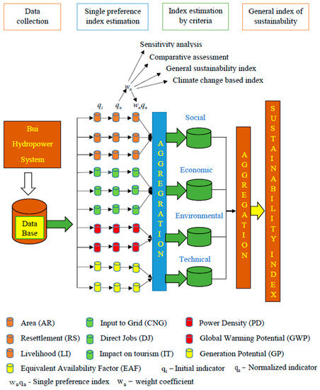 The flowchart (Figure 2) shows how sustainability assessment of the Bui dam was done. The method is a sequence of data collection, estimation of single preference index, estimation of index by criteria, and, finally, determination of the general sustainability index (a measure of sustainability assessment). The assessment process is shown in Figure 2 and described in detail in Section 3.1 and Section 3.2 below.