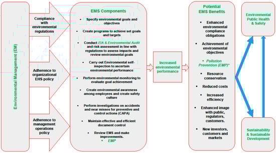 EM/EMS Model. EM—environmental management; EMS—environmental management system; EIA—environmental impact assessment; * EMP—environmental management plan; EHS—environmental health and safety.