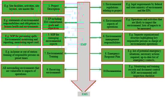 Rizzolo [76] describes EMP (Figure 3) as the plan drawn up during the EIA process that spells out a description of the methods and procedures for checking and reducing impacts. It enhances the awareness and adoption of EM best practices by business and project owners. EMP should be fundamentally entrenched in considerations of resource prevention and pollution abatement, including air pollution, liquid effluents, solid wastes, noise pollution, disaster planning, environmental responsibilities, house-keeping, human settlements, recovery/reuse of waste products, occupational safety and health prevention, maintenance and operation of environment control systems, vegetal cover, among others [77].