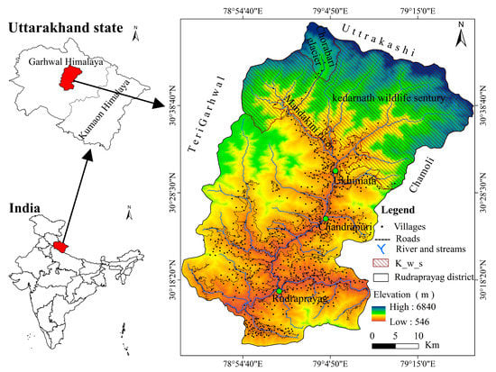 The study area, i.e., the Rudraprayag district, is an area of the vulnerable zone in the Garhwal Himalaya region of the Uttarakhand state in India. It extends from 30°12′58″ N to 30°48′47″ N latitude and 78°50′07″ E to 79°22′34″ E longitude. The geographical area of the Rudraprayag district is around 1936.06 km2 (Figure 1). As per the report of the Disaster Mitigation and Management Centre (DMMC), the Rudraprayag district is a land of deep valleys, high ridges, and steep mountains. It is comprised of two main tectonic units, viz. the Garhwal group and Central Crystalline group, and covers two sections of the Himalaya: the Lesser Himalaya and Greater Himalaya [36,37]. In the study area, rainfall is highly variable depending upon the altitude. In the southern part of the district at Rudraprayag, the average annual rainfall is around 1220 mm, while in the central part at Chandrapuri, the average annual rainfall is 1751 mm, and the rainfall in the northern higher part at Ukhimath is 1995 mm [38]. The overall average rainfall in the district is 1485 mm. Most of the rainfall (70–80% of annual precipitation) occurs from June to September. The mean air temperature in winter (December to February) varies from 8.32 to 13.15 °C and from 27.75 to 32.54 °C in summer (May to July) [38]. The altitude varies from 546 to 6840 m above sea level (Figure 1). Mandakini is the major river of the district, with a catchment area of 1641.64 km2, and it has many tributaries. It originates from the Chorabari glacier (3895 m) (Figure 1).