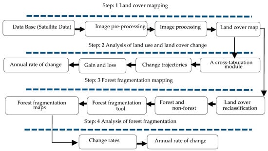 Figure 2 shows the overall methodological framework. Land cover maps were derived based on Landsat images for the years 1976, 1998, and 2014, using supervised classification with the maximum likelihood method. Then, land cover maps were analysed to understand the changes in land-use and land-cover, using the cross-tabulation module detection method in Arc GIS. Finally, all land cover maps were converted to forest and non-forest areas to detect forest fragmentation areas, using the landscape fragmentation tool (LFT v2.0). The details of the procedure are given in the following sections.