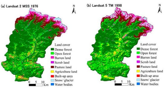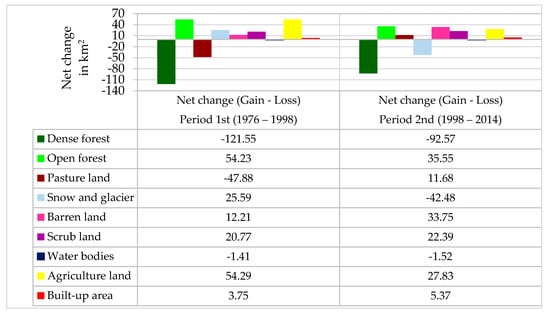 The net change in the form of gains and losses for each class during the 1st period (1976–1998) and the 2nd period (1998–2014) is shown in Figure 4. The highest loss was in the dense forest (121.55 km2) during the 1st period, followed by pasture land (47.88 km2), and water bodies (1.94 km2), while a significant gain was observed in agriculture land (54.29 km2), open forest (54.23 km2), snow and glacier (25.59 km2), scrub land (20.77 km2), barren land (12.21 km2), built-up area (3.75 km2), and water bodies (1.41 km2). An overall loss of 67.32 km2 of forest area (dense and open forest) was observed during the 1st period. On the other hand, the highest loss was observed in dense forest (92.57 km2) and snow and glacier (42.48 km2), while significant gains were observed in open forest (35.55 km2), barren land (33.75 km2), agriculture land (27.83 km2), scrub land (22.39 km2), pasture land (11.68 km2), and built-up area (5.37 km2) during the 2nd period. An overall loss of 57.03 km2 of forest area (dense and open forest) was observed during the 2nd period. However, the overall net change was the highest during the 1st period.