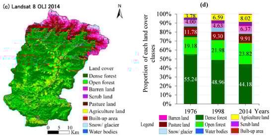 Land-cover map for the year (a) 1976; (b) 1998; and (c) 2014; and (d) comparison of land use and land cover classes by percentage of the total study area (study area = 936.06 km2).