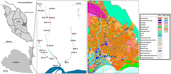 The Galing River is the main drainage system of the Kuantan area and it flows through the most urbanized area of Kuantan city, located on the east coast of peninsular Malaysia. Kuantan is the state capital of Pahang and the 17th largest city in Malaysia [6]. The National Physical Plan 2005 identified Kuantan as one of the country’s future growth centers and a hub for trade, commerce, transportation, and tourism, owing to its strategic location on the east coast. Following the implementation of the “Kuantan District Locality Plan 2004–2015” over the past decade, the area has developed rapidly, resulting in environmental degradation [7,8,9,10]. As shown in Figure 1, the east coast area of Kuantan city has been notably urbanized and agricultural and forest regions have been converted to housing and business/servicing purposes during this period.