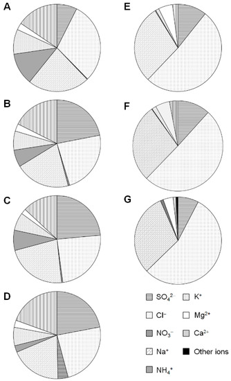 Comparison of ion concentration ratios of Galing River water samples collected upstream ((A) Average ionic concentration ratio of G1a-1 to 6, (B) G1b-1 to 2, (C) G1c-1 to 4 (D) G2-1 to 4) and downstream ((E) Average ionic concentration ratio of G1a-7 to 8, (F) G2-5) and sea water ((G) sea water [19]).