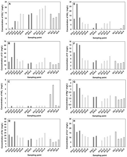 Changes in ionic concentrations: (A) SO42−; (B) Cl−; (C) NO3−; (D) Na+; (E) NH4+; (F) K+; (G) Mg2+; and (H) Ca2+ in the Galing River.