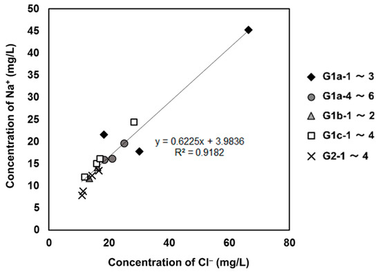However, concentration of Cl− and Na+ are strongly affected by human activity along with geological conditions, especially in regions without brackish-water [16,17]. Additionally, types of ionic pairs that originate from human activity are mostly in the form of NaCl [16,17,18]. Good correlation was obtained between Na+ and Cl−, as shown in Figure 4. Thus, these ionic species can be used as one of the parameters to reflect human activity [16,17,18]. The lowest and the highest average concentration of Cl− and Na+ were detected in G2 (Cl−: 13.3 mg/L and Na+: 10.6 mg/L) and G1a-1 to 3 (Cl−: 38.2 mg/L and Na+: 28.2 mg/L), respectively. Relatively low environmental burden and low anthropogenic effect were detected in G2 in terms of Cl− and Na+ concentration compared to other sampling points.