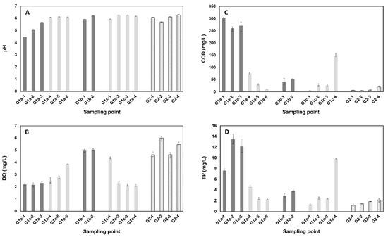 Changes in water quality indexes: (A) pH; (B) DO: Dissolved oxygen; (C) COD: Chemical oxygen demand; and (D) TP: Total phosphorus in the Galing River.