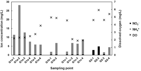 In this section, we discuss the influences of NO3− and NH4+ on DO because these parameters are closely related to the environment load. The relationship between NO3−, NH4+, and DO is indicated in Figure 6. As shown in Figure 6, G1b-1 to 2, G1c-1, and G2-1 to 4 were under oxygenated conditions (>4 and ≤6 mg/L) while other sampling points were under low oxygen conditions (>2 and ≤4 mg/L) [21].