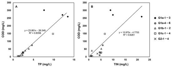 Our research group focused on the differences in the correlation between COD and TP or TIN (Total inorganic nitrogen: NH4+–N and NO3−–N). In this section, we discuss the relationship between change in COD with variation in TP and TIN, because these parameters are inextricably associated with different types of anthropogenic environment loads.