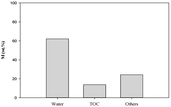 Mass percents (M) of water, total organic carbon (TOC), and others in the liquid products produced from the torrefaction of waste bamboo chopstick (WBC) at 563 K and 40 min. Concentration of TOC (CTOC) = 137,000 mg L−1. Mass of liquid products (mL) = 0.43 g and volume of liquid products (VL) = 0.41 mL.
