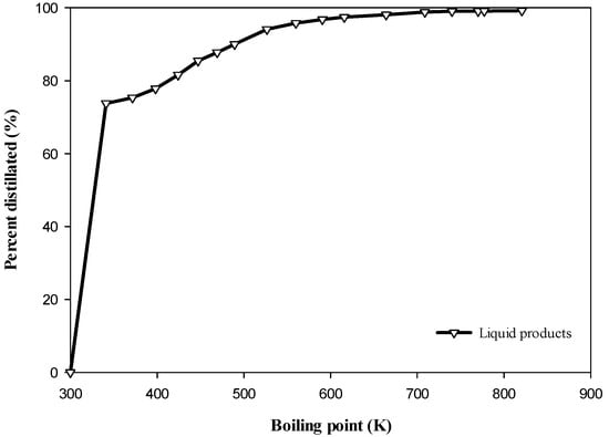 For the sake of determining the distribution of organic compounds of different boiling points (bps) in the liquid product, simulated distillation gives an index to compare the liquid product with different oils. From the simulated distillation in Figure 2, the major compositions, excluding the water of the liquid products, are low bp organic compounds (bp < 341 K) which have a carbon number below C6. The results of the liquid products are more similar with gasolines 92, 95, and 98, which are comprised of isooctane (C8) and heptane (C7) with a low carbon number [16].