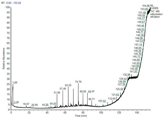 The equipment for simulated distillations of the liquid product from torrefaction and various oils to determine the carbon number of organic compounds, included gas chromatography with a flame ionization detector (FID) (Agilent 6890 Chemstation, Hewlett Packard Inc., Wilmington, DE, USA), equipped with a column (UA-1 (HT) with 15 m length × 0.53 mm ID × 0.25 μm thickness, Frontier Laboratories Ltd., Fukushima, Japan) and an integrator (HP 3395, Agilent Technologies Inc., Santa Clara, CA, USA).