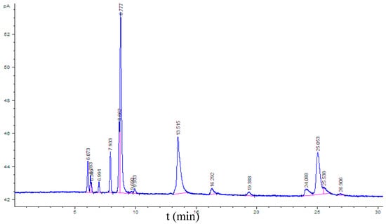Through GC-FID, the spectrum of the gaseous products from the torrefaction of WBCT is illustrated in Figure 4. Many peaks can be seen, representing different appearance times. Compared with the GC-FID spectrum of the standard gases of hydrocarbons, the peaks could be sorted according to the similar chemical polarity of the alkanes.